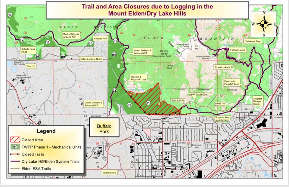 New closures due to logging will affect Mount Elden from July 16 2018, possibly through July 2019. According to the Northern Arizona Climbers Coalition (NAzCC):